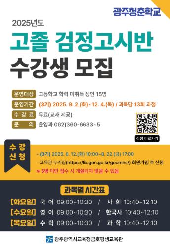 3기 과정은 내년 4월 실시되는 ‘2026년도 1회 고졸 검정고시 시험’에 대비해 고등학교 학력 미취득 성인을 15명 모집해 운영한다.