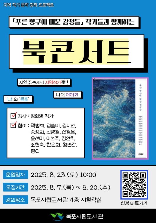 이번 북콘서트는 지역 작가 문학강좌 수강생 13명이 목포의 역사, 풍경, 삶의 흔적을 자신만의 시각으로 풀어낸 공동 에세이집 '푸른 항구에 머문 감정'들의 제작 과정과 주요 내용을 중심으로, 작가와 시민이 함께 소통하는 문학의 장으로 마련됐다.