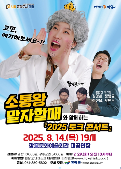 장흥군(군수 김성)은 “불쾌지수가 올라가는 더운 여름, 말자할매의 시원한 고민 상담을 들으며 무더위를 날려 보내길 기대한다”또한 “가족, 연인, 친구와 함께 제2회 장흥미술제 전시회도 둘러보고 문화공연도 관람하는 의미있는 시간이 될 것”이라고 말했다.