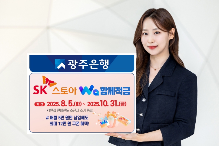 ‘[SK스토아]Wa함께적금’은 만 14세 이상 실명 개인 고객을 대상으로 1인 1계좌로 가입 가능한 6개월제 정기적금 상품이다. 월 납입한도는 최대 50만 원이며, 영업점 방문 없이 비대면 채널(광주와뱅크, 모바일웹뱅킹)을 통해 간편하게 가입할 수 있다.