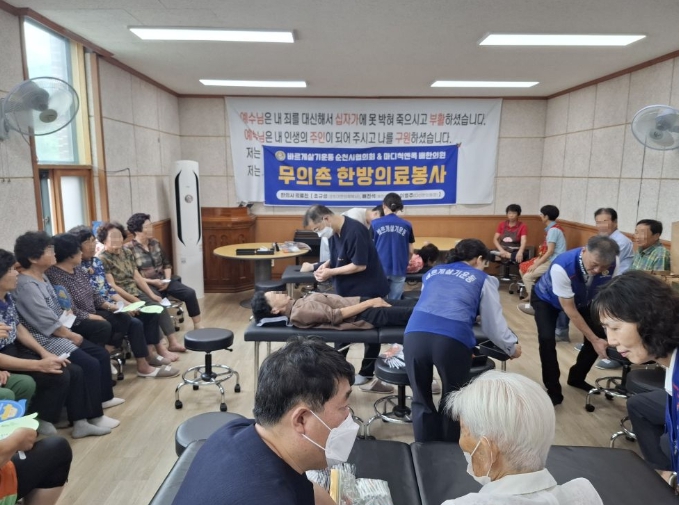 또한, 바르게살기운동순천시협의회 황전면·풍덕동 회원 20여 명은 대기순서 안내, 파스 등 후원물품을 전달하며 의료봉사활동이 원활이 이뤄질 수 있도록 도왔다.