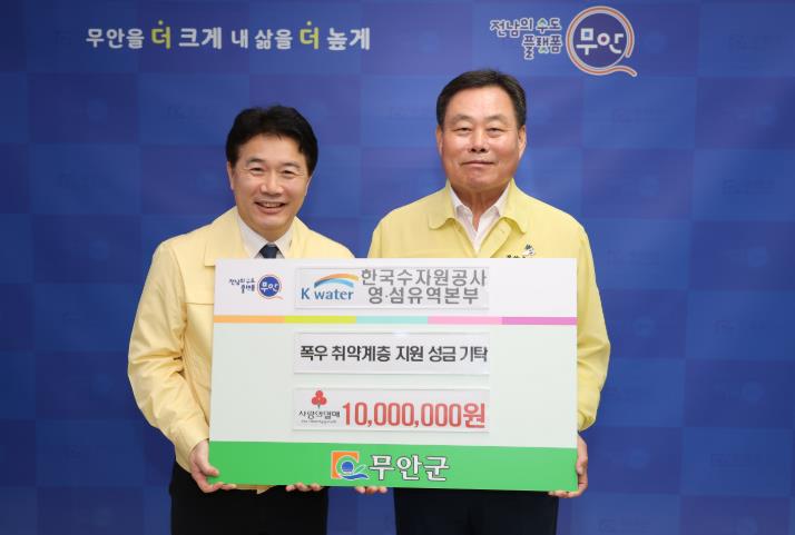 김산 군수는 “무안군민들을 위해 따뜻한 마음을 모아주신 한국수자원공사에 깊이 감사드린다”며, “군에서도 집중호우로 힘들게 지내는 주민들의 일상생활 회복을 위해 최선을 다하겠다”고 밝혔다.