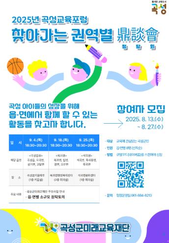 일정은 ▲9월 4일(곡성읍·오곡면·삼기면·고달면) ▲9월 18일(옥과면·입면·겸면·오산면) ▲9월 25일(석곡면·목사동면·죽곡면)이며, 각 권역 주민이 참여할 수 있다.