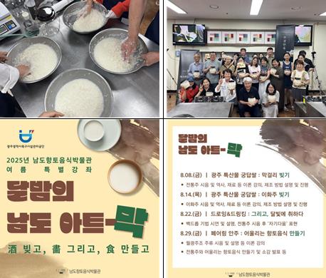 이번 강좌는 남도의 전통 식문화를 예술적 감성으로 재해석한 융복합 체험형 문화예술교육으로 지역의 기후와 농경문화가 녹아있는 발효 유산인 ‘술(酒)’, 감정과 경험을 표현하는 창작 활동인 ‘그림(畵)’, 남도의 사람과 문화가 어우러진 일상의 예술인 ‘음식(食)’ 만들기를 통해 향토음식문화를 경험해보는 좋은 기회가 될 것이다.