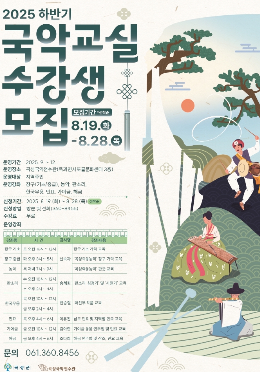 한편 곡성국악전수관은 지난 8월 4일부터 9일까지 ‘2025 여름방학 청소년 국악 특강’을 운영해 초등학생 15명이 장구·가야금·해금을 배우는 시간을 가졌다.