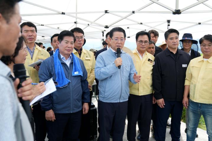김영록 지사는 콤바인을 직접 운전하면서 벼 수확 시연에 참여하고, 농업인들과 일일이 인사를 나누며 격려했다.