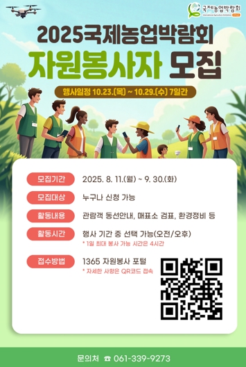 박관수 전남도국제농업박람회 사무국장은 “자원봉사자는 단순한 보조 인력이 아닌 박람회를 함께 이끌어갈 운영 인력”이라며 “자원봉사자 모집에 많은 관심과 참여 바란다”고 말했다.