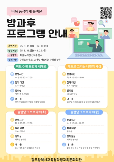 대상은 초등학교 4~6학년 학생과 중학생이다. 개설 강좌는 ▲비트 ON! 드럼의 세계로 ▲패드로 그리는 나만의 세상 ▲슬램덩크 프로젝트 초등부 ▲슬램덩크 프로젝트 중등부 등 예술·체육 관련 4개다. 각 강좌는 15명씩 총 60명이 참여할 수 있다.