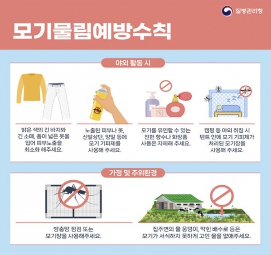 이외에 예방수칙으로는 ▲ 야외활동 시에는 밝은 색의 긴팔·긴바지 착용 및 기피제 사용 ▲방충망 정비와 모기장 사용 ▲ 풀숲·물웅덩이 근처에 가지 않기 ▲ 축사 위생환경 관리하기 ▲진한 향수나 화장품 사용 자제 등 모기물림 예방수칙을 준수해 줄 것을 당부했다.