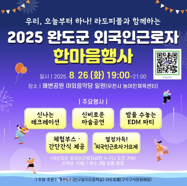 ‘완도에서 세계가 하나 되는 시간’이라는 주제 아래 다양한 문화 공연과 참여형 프로그램이 운영되며, 군과 외국인 근로자 간 상생과 화합의 메시지를 담은 드로잉(이미지화) 퍼포먼스가 진행될 계획이다.