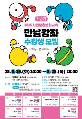 순천문화재단 관계자는 “만날강좌는 시민들이 일상 속에서 쉽게 문화예술을 접하고 즐길 수 있도록 마련된 생활문화교육이다”며 “이번 하반기 프로그램을 통해 생활문화교육 환경을 선제적으로 바꿔나가고 활성화될 수 있는 계기가 되기를 바란다”고 전했다.