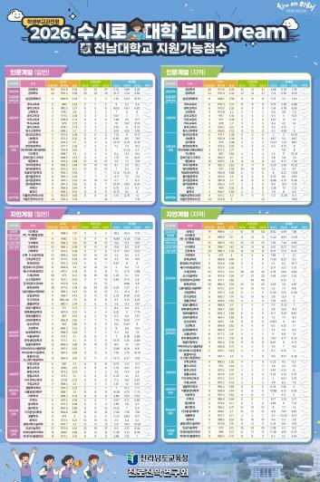 ‘2026. 대입일정 정리해 DREAM’은 원서 접수, 합격자 발표, 대학별 전형 일정 등 주요 대입 일정을 한눈에 볼 수 있도록 정리한 것이며, ‘2026학년도 수시로 대학 보내 DREAM’은 서울 주요 대학, 의약학계열, 전남대 교과전형의 합격 가능 등급 및 교과 환산 점수를 예측한 자료이다.