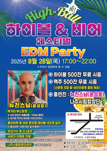 나주시가 오는 8월 28일 오후 5시부터 빛가람로 696 일원에서 ‘2025 나주시 빛가람 하이볼&비어 페스티벌’을 열고 하이볼과 맥주 시음 행사, DJ 공연, 먹거리와 플리마켓 등 다채로운 프로그램으로 시민과 관광객을 맞이한다.