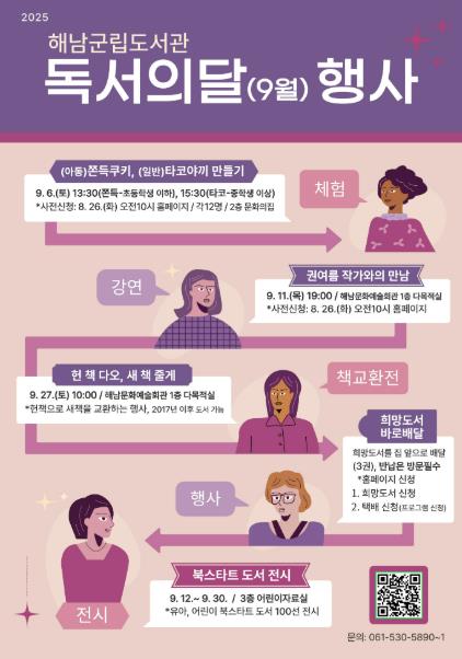 체험과 강연 등 일부 프로그램은 8월 26일부터 사전 신청이 필요하다. 자세한 일정 및 신청 방법은 해남군립도서관 누리집 또는 전화를 통해 확인할 수 있다.