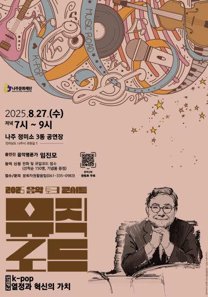 19일 문화재단에 따르면 오는 8월 27일 나주정미소에서 열리는 ‘뮤직로드 Step 2’에는 국내 대표 대중음악 평론가 임진모를 초청해 K-POP의 열정과 혁신을 주제로 음악과 이야기를 풀어낼 예정이다.
