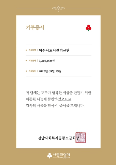 이번 성금은 전국 각지에서 발생한 집중호우 피해 지원을 위해 공단 임직원의 자발적인 동참으로 마련됐으며, 사회복지공동모금회 전라남도지회를 통해 긴급구호와 생필품 지원에 사용될 예정이다.