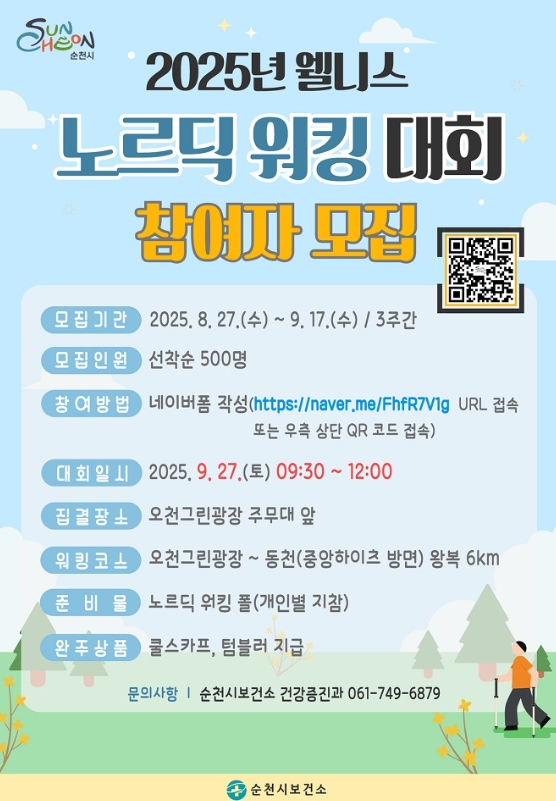 노르딕 워킹에 관심이 있는 국민 누구나 참여 가능하고, 참여를 원하는 국민은 9월 17일까지 순천시 홈페이지와 SNS(블로그·인스타그램·네이버밴드)를 통해 네이버폼(QR코드 또는 링크)으로 신청하면 된다.