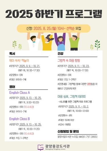 이번 하반기 프로그램은 ▲그림책 속 마음 탐험 ▲마음 쉼표, 그림책 테라피 ▲재미 쏙쏙! 책놀이 ▲English Class A(6~7세) ▲English Class B(초등 1~3학년) 총 5개 강좌로, 오는 9월 9일부터 10월 25일까지 운영된다.
