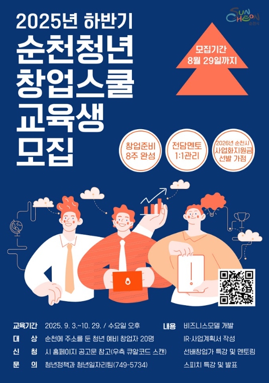 모집대상은 순천시에 주소를 두고 사업자등록을 하지 않은 청년이며, 모집인원은 선착순 20명이다. 교육비는 무료이며, 교육 수료생에게는 수료 후 1년 동안 순천시 청년창업 성장지원사업 선발 시 가점 혜택 등도 제공할 예정이다.