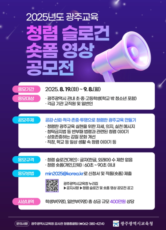 대상은 광주지역 학생, 학교 밖 청소년, 교직원, 일반인 등이며, ‘공감·신뢰·적극·존중·투명으로 청렴한 광주교육 만들기’를 주제로 청탁금지법 준수, 갑질 문화 개선, 일상 속 청렴 실천 등의 내용으로 제작하면 된다.