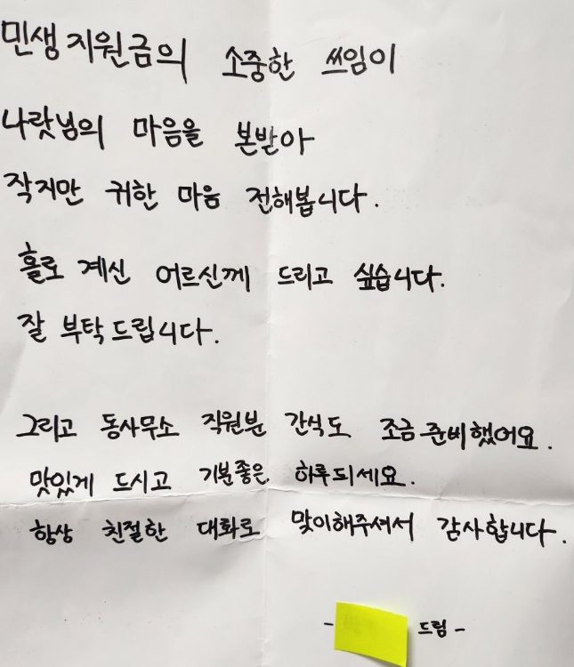 이번에 전달된 후원물품은 △백미 10kg 2포 △사이다 1박스 △초코파이 1상자다. 기부자는 대리인을 통해 조용히 기부 의사를 전하며, “민생지원금의 소중한 쓰임을, 작지만 귀한 마음으로 전해 봅니다”라는 글귀가 담긴 손 편지를 함께 전달했다.