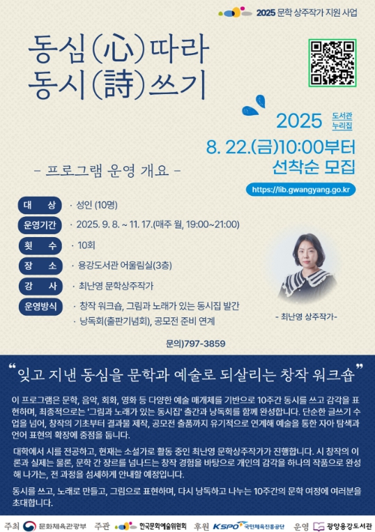 김현숙 광양시 도서관과장은 “용강도서관의 문학상주작가 지원사업을 통해 작가와 책, 지역 주민이 소통으로 연결되고 지역사회에 독서문화가 확산되길 기대한다”며 “이번 하반기 성인 대상 동시쓰기 프로그램에도 많은 시민이 참여하길 바란다”고 말했다.