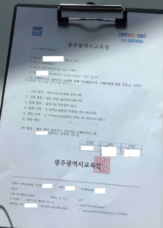 이정선 교육감은 “시교육청은 소속 공무원이 개별 업체에 직접 연락해 계약이나 납품을 요구하는 일은 결코 없으며, 특히 현금 요구나 타 물품 구매·납품을 조건으로 한 요청은 100% 사기이므로 반드시 사실 여부를 확인해야 한다”며 “조금이라도 수상한 연락을 받을 경우 경찰(112)에 신고해 주시길 바란다”고 말했다.