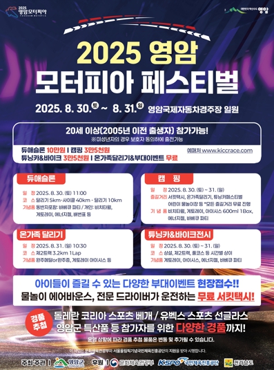 한재진 영암군 기업지원과장은 “자동차경주장 서킷이라는 특별한 공간에서 모터스포츠를 체험하고 즐길 수 있는 대한민국 유일의 축제다. 지역 관광과 경제 활성화에 기여하는 영암 대표 축제에 많은 분들의 관심과 참여 바란다”고 말했다.