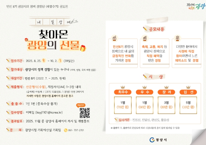 참여 대상은 광양시 정책을 경험한 전국민으로, 신청은 1인 1작품이 원칙이며 시 누리집에서 서식을 내려받아 A4용지 1~3장 분량의 정책 체험담을 10월 2일까지 이메일로 접수하면 된다.