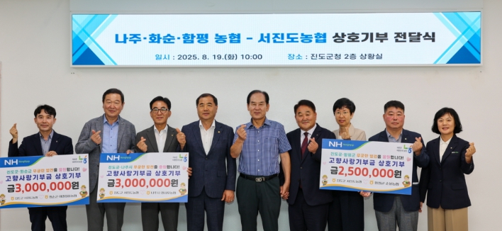 기부금 전달식에는 김희수 진도군수를 비롯해 엔에이치농협(NH농협) 황지연 진도군지부장, 강성민 서진도농협 조합장, 재해중 나주시지부장, 장행준 영산포농협 조합장, 최우영 화순군지부장, 안상섭 이양청풍농협 조합장, 곽선미 함평군지부장, 정기현 손불농협 조합장 등 관계자들이 참석했다.
