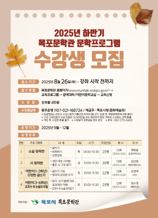 수강 신청은 8월 26일부터 강좌 시작 전까지 목포문학관 홈페이지에서 선착순 접수 가능하며, 수강료는 강좌별 4만 원이다.