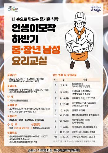 이번 특강은 중·장년 남성들의 은퇴 후 독립적인 식생활을 돕기 위해 마련됐으며, 가정에서 만들기 쉬운 생활 요리(기본 찌개 및 반찬 등)를 실습하는 과정으로 운영될 예정이다.