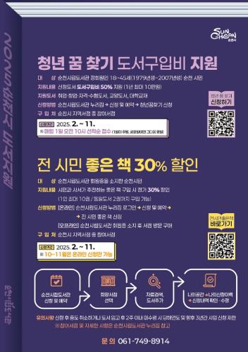 먼저 '청년 꿈 찾기' 사업은 만 18세부터 45세까지 순천 시민을 대상으로 도서구입비의 50%, 1인당 최대 10만 원을 지원한다.