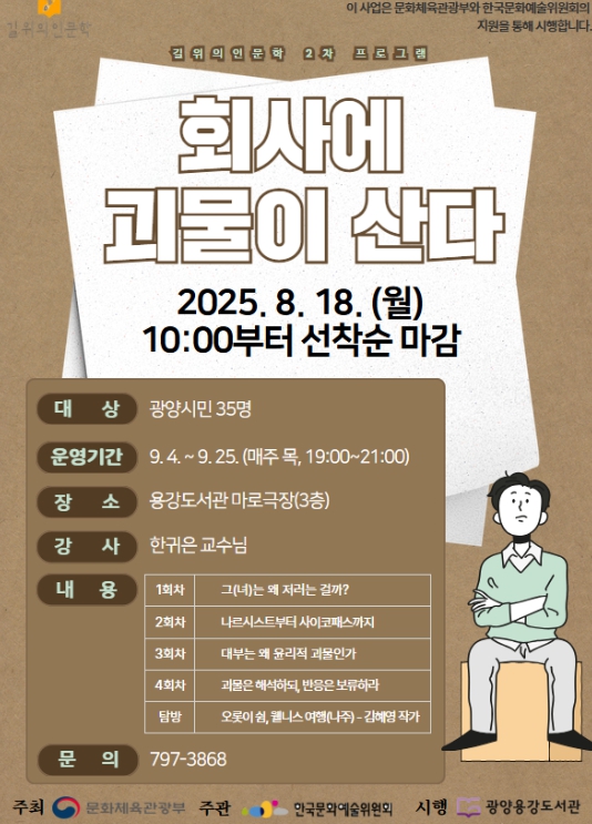 오는 9월 4일부터 시작되는 2차 프로그램은 ‘회사에 괴물이 산다’를 주제로 매주 목요일 저녁 7시부터 2시간 동안 총 4회에 걸쳐 진행된다.