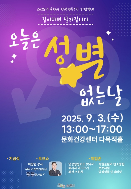 시 관계자는 “이번 행사는 성별 고정관념을 넘어, 가족과 지역사회에서 평등한 일상을 함께 만들어가자는 메시지를 담고 있다”며 “시민 여러분의 많은 참여를 통해 순천이 더 따뜻하고 평등한 도시로 자리매김하길 기대한다”고 전했다.