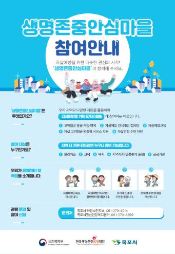 ‘생명존중 안심마을’은 보건복지부 제5차 자살예방 기본계획의 추진 과제로, 지역 내 다양한 자원을 활용해 맞춤형 자살예방사업을 수행하는 마을이다.