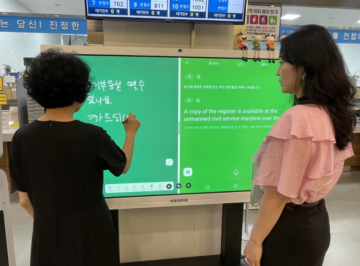 외국인 민원인도 외국어 음성을 입력하면 전자보드를 통해 4개국 언어를 동시통역 서비스를 실시간으로 받을 수 있다.