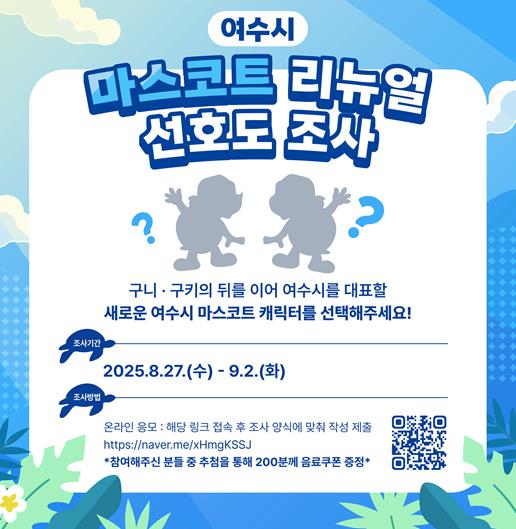 시 관계자는 “시민 한분 한분의 의견이 여수의 이미지를 결정하는 중요한 힘이 된다”며 “최적의 안이 선정될 수 있도록 선호도 조사에 많은 관심과 적극적인 참여를 부탁드린다”고 말했다.