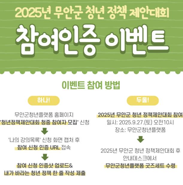 아울러 청중 참여 이벤트도 함께 열린다. 8월 18일부터 9월 19일까지 무안군청년플랫폼 홈페이지에서 신청할 수 있으며, 참여자는 이벤트 URL에 접속해‘대회 청중 신청 인증샷’과 함께‘내가 바라는 청년정책’을 작성하면 된다. 이벤트 참가자에게는 무안군청년플랫폼 굿즈 세트가 제공된다.