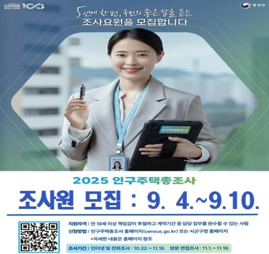 지원 희망자는 광양시 누리집 공고란에 게시된 '2025년 인구주택총조사 조사원 모집'을 확인한 뒤, 광양시청 총무과 문서통계팀에 본인이 직접 방문해 접수하면 된다.