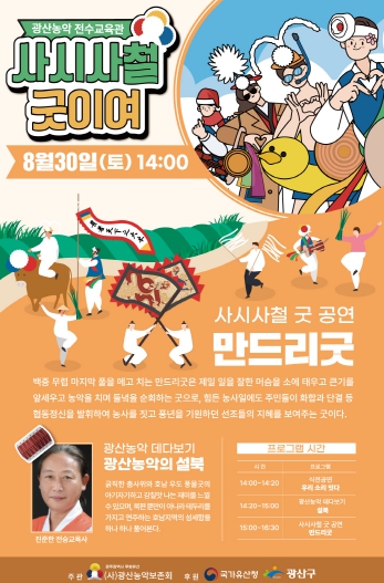 ‘사시사철 굿이여’는 시민 누구나 참여할 수 있으며, 자세한 문의는 광산농악전수교육관으로 하면 된다.