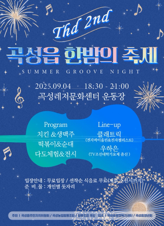 축제 관계자는“이번 축제는 단순한 행사를 넘어, 지역민들의 친목과 화합의 장을 마련하여 전 세대를 아우르고 주민 모두 하나 되어 소통하는 뜻깊은 자리”라며, “곡성읍의 밤을 아름답게 수놓을 축제에 주민분들의 관심과 참여를 바란다”라고 덧붙였다.