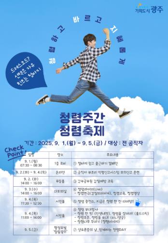 특히 청렴주간 첫날인 9월 1일 오전 출근길에는 고광완 행정부시장이 직원들에게 청렴 기념품을 전달하며 청렴한 광주 조성을 홍보한다.