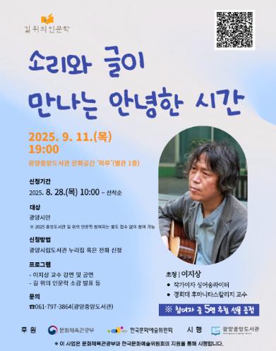 남수향 중앙도서관팀장은 “길 위의 인문학의 대미를 장식할 이번 후속모임에 시민 여러분의 많은 관심과 참여를 부탁드린다”며 “참가자들이 일상의 소리를 새롭게 듣고 글로 서로를 연결하는 인문학적 경험을 하게 되길 기대한다”고 말했다.