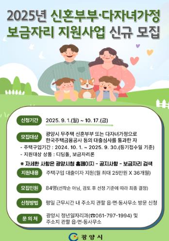 조동수 청년일자리과장은 “지원사업이 신혼부부와 다자녀가정의 주택 구입 부담을 덜고, 출산 친화적인 사회 분위기 조성에 기여할 것으로 기대한다”고 말했다.