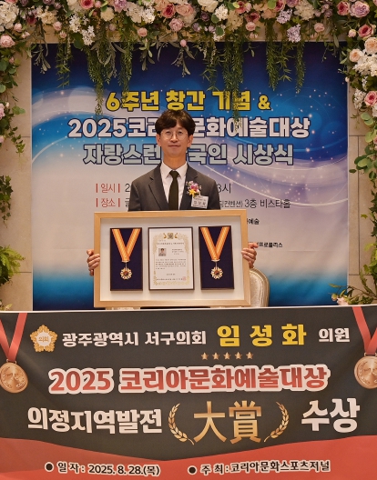 '2025 코리아문화예술대상&자랑스런 한국인'시상은 다양한 분야에서 지역사회 발전에 공헌한 인물들을 발굴하여 시상한다. 임성화 의원은 지역행정 혁신과 주민 복지 증진을 위한 노력이 크며, 특히 생활안전과 지역문화 활성화에 기여한 의정활동의 공로를 주요하게 인정 받았다.