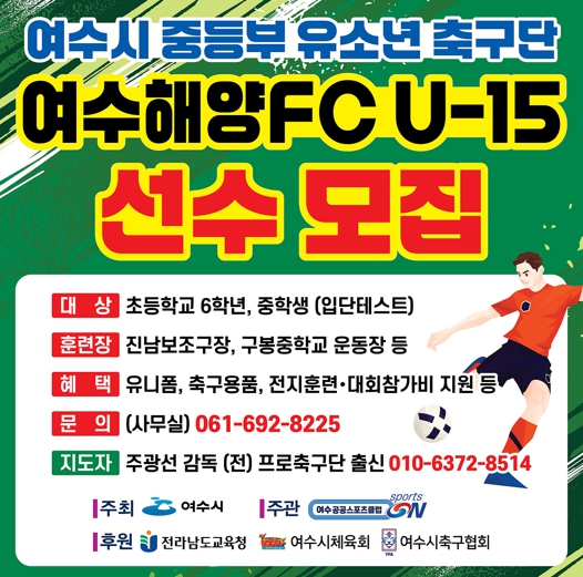 관심 있는 축구 꿈나무와 학부모는 여수공공스포츠클럽으로 문의하면 된다.