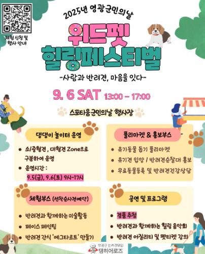 영광군민의 날 추진위 관계자는“위드펫 힐링페스티벌은 단순한 반려견 행사를 넘어 반려인·비반려인 모두가 함께 어울리고, 반려견과 교감하며 지역 사회의 유기동물 문제 해결과 올바른 반려동물 문화 확산에 큰 기여를 할 것”이라고 밝혔다.