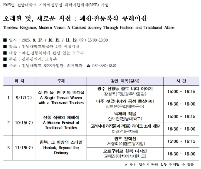 1일 전남대학교는 전남대학교는 지역과 대학의 동반 성장을 이끄는 RISE 사업단과 의류학과가 공동 주최하는 ‘오래된 멋, 새로운 시선: 패션‧전통복식 큐레이션 교육 프로그램’을 마련해, 오는 9월 17일·10월 15일·11월 19일 세 차례에 걸쳐 여섯 가지 주제 강연을 진행한다고 밝혔다.