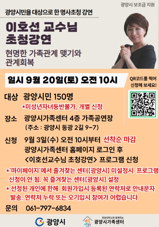 이주화 광양시가족센터장은 “이번 강연이 가족 구성원 간의 관계를 돌아보고 더욱 건강하고 행복한 가족으로 나아가는 계기가 되길 바란다”고 말했다.